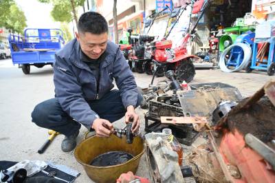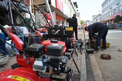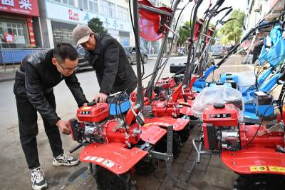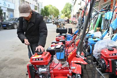春分到,农事忙。春耕大忙之际,在农机补贴等多项惠农政策的加持下,各地农民维修、新购小型农业机械助力春季农业生产。2024年3月19日,湖北省十堰市郧阳区刘洞镇集镇,农民在农机服务部维修、选购微耕机。视界网王涛摄