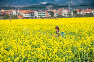 3月19日,武穴市油菜花竞相绽放,花桥镇农民忙碌着加强田间管理,为丰产增收打好基础。武穴市油菜花种植面积在40万亩左右,被称之为“中国油菜之乡”。