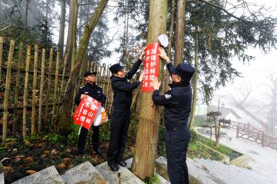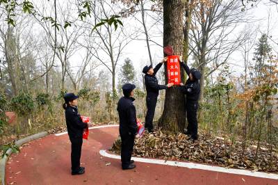 2024年3月19日,民警在保康县官山林场张贴森林防灭火宣传标语。