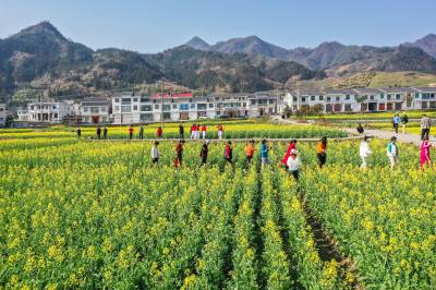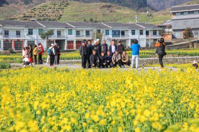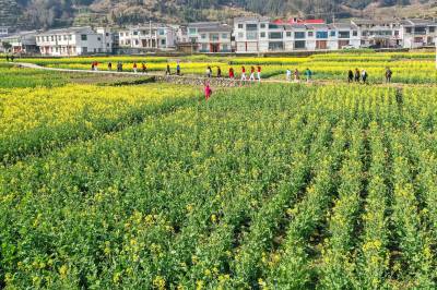 2024年3月22日,油菜花陆续绽放,来自陕西省安康市平利县的组团游客,在湖北省十堰市竹溪县蒋家堰镇敖家坝村片区油菜花海游玩赏花,拍照留影,乐享春光。