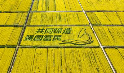 3月月26日,在嘉鱼县陆溪镇官洲村 油菜绿色高质高效生产核心示范片,七彩油菜,“共同缔造 富国强民”八个大字荷叶造型所构成的画卷,在30余亩农田上徐徐展开,蔚为壮观展现陆溪镇、嘉鱼县的美好愿景。