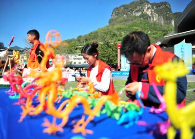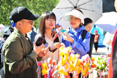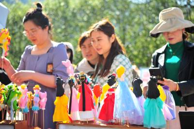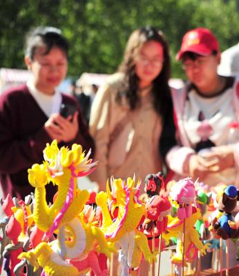 2024年3月29日,宜昌市夷陵区黄花镇三峡大瀑布景区,游客在“非遗文化进景区”展台前观赏民间艺人制作的面塑作品。当日,宜昌市夷陵区“悦见山水黄花·擘画全域振兴”2024年“乐游黄花”乡村游在三峡大瀑布景区启幕,在“非遗文化进景区”活动现场,面塑、版画、皮影戏、剪纸等10个非遗项目的传承人创作展示非遗作品,呈现出一个集纳众多传统手艺精品的创意集市。近年来,当地将非遗项目植入旅游产业链,推动传统文化和旅游双向融合,在丰富景区产品供给的同时,助力文化传承和旅游产业融合发展。(视界网 张国荣 摄)