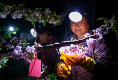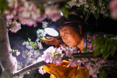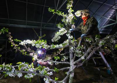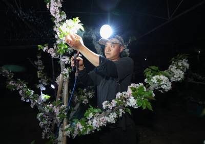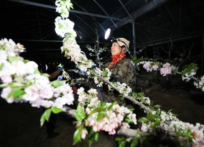 3月29日,在襄阳市襄城区卧龙镇新建村车厘子种植基地智慧大棚,工人进行花期授粉。