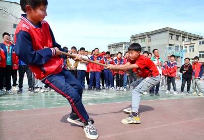 2024年4月9日,湖北省十堰市郧阳区柳陂镇中心小学“大课间”,小学生在进行“趣味体育”锻炼。