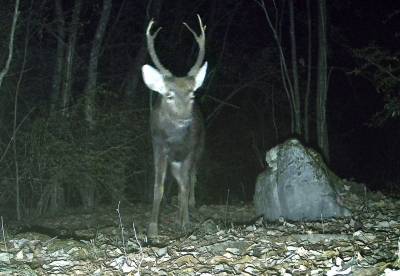 据了解,这只梅花鹿是在位于该保护区核心区海拔1382米处针阔混交林中拍摄到的。它的头部有一对主角,已骨化,主角向两侧弯曲,略呈半弧形,角上有杈,角尖稍向内弯曲,非常锐利。 梅花鹿晨昏活动,性情机警,行动敏捷,遇到危险,奔跑迅速,能在灌木丛中穿梭自如。