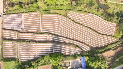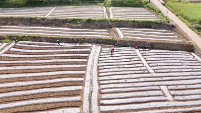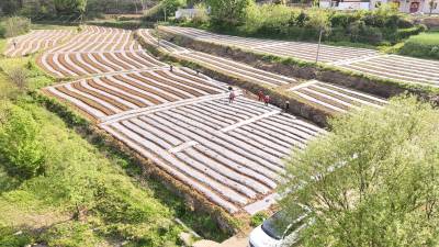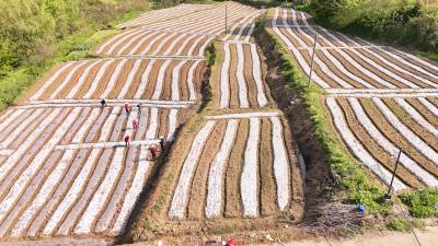 三月三, 春种忙。在十堰市郧阳区各地,当地农民抢抓农时忙春种。2024年4月11日农历三月三,十堰市郧阳区青曲镇红门铺村农民在土地里为早糯玉米和早白菜覆盖薄膜。(无人机照片)视界网王涛摄