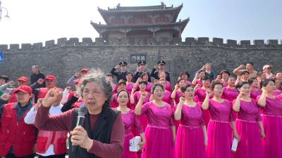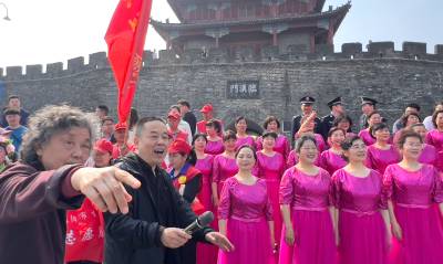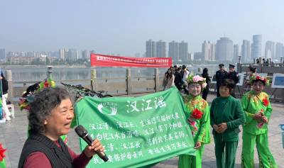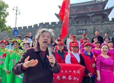 4月22日,在襄阳临汉门下小北门广场,“绿色汉江”保护协会发起人运建立领唱自编的环保歌谣,这是八旬“环保奶奶”运建立第1210场环保宣讲。