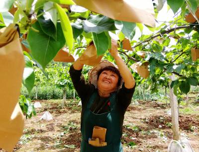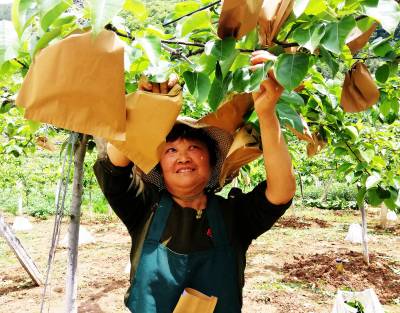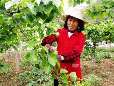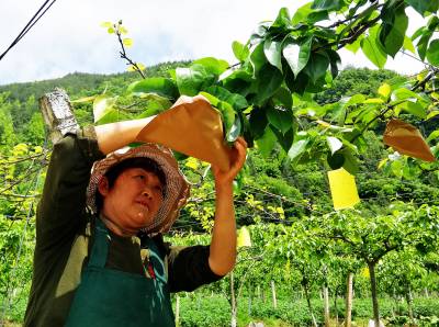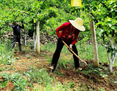 4月23日,巴东县官渡口镇下马洞村村民在自家梨园剪枝蔬果、挖沟施肥、防虫套袋,为赢得今年好收成不惧炎热、不辞辛劳。