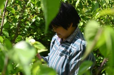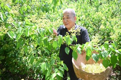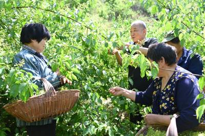 2024年5月13日,在湖北省十堰市郧阳区城关镇堰河村拍摄的十堰仙丰公司的神仙叶繁育基地,基地负责人李启斌和工友们正在采摘神仙叶花蕾。视界网王涛摄
