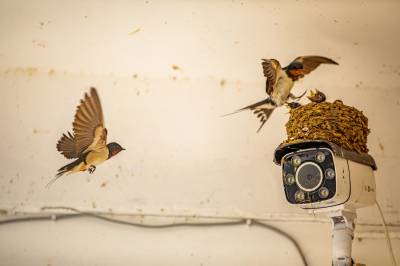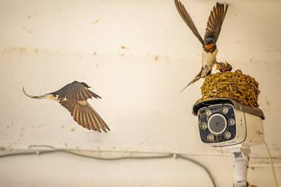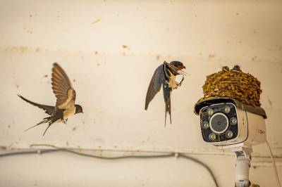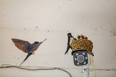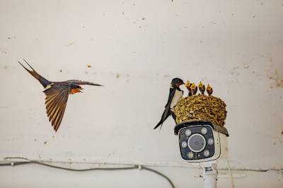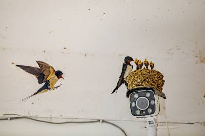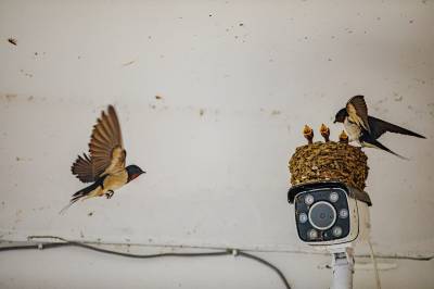 据村干部杨明德介绍,燕子每年都会在屋檐下筑巢。今年春天,两只大燕子选择在摄像头上筑巢。一段日子后,五只小燕子就出生了,大燕子又忙活起抚育子女的重任。