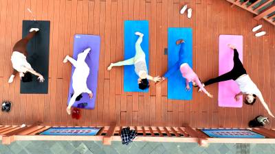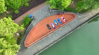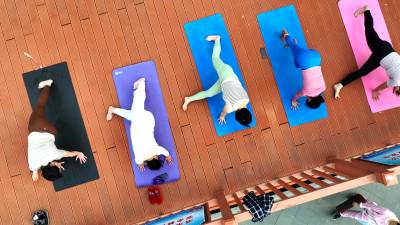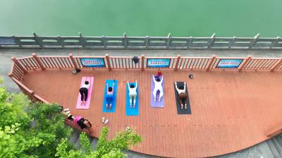2024年5月16日,十堰市房县马栏河与大河交汇处的城区段半岛湾河流湿地公园,树木葱郁、流水潺潺,当地市民在河流观光廊台练瑜伽。