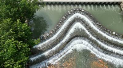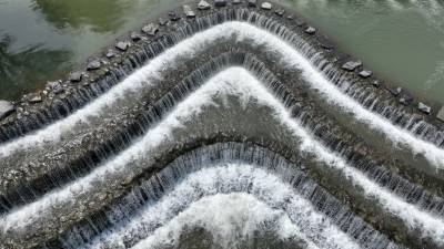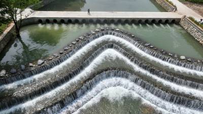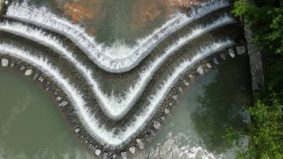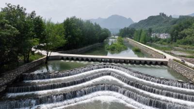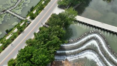 2024年5月27日,十堰市房县盘峪河军店镇中村白鹤湾段河流湿地公园景区人工瀑布飞流直下,亲水休闲观光产业为当地带来可观的经济收入。