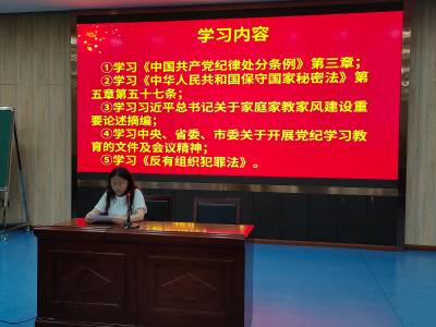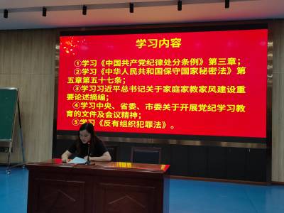 活动中,全体党员齐唱国歌,重温入党誓词。大家学习了《中国共产党纪律处分条例》《中华人民共和国保守国家秘密法》第五章第五十七条;《反有组织犯罪法》;习近平总书记关于家庭家教家风建设重要论述摘编及中央、省委、市委关于开展党纪学习教育的文件及会议精神。