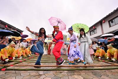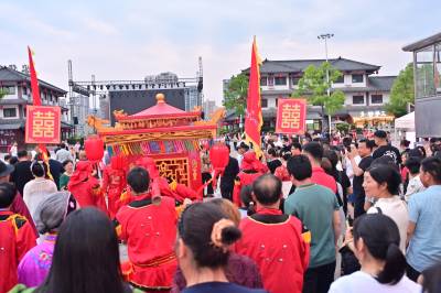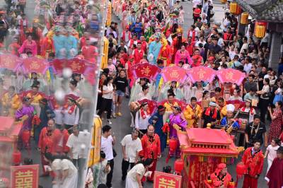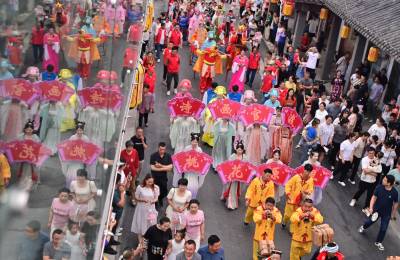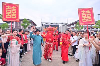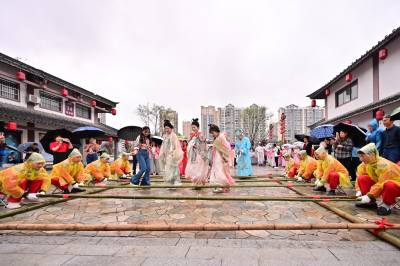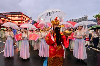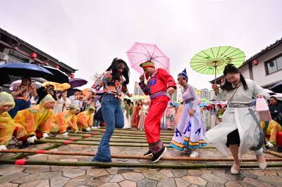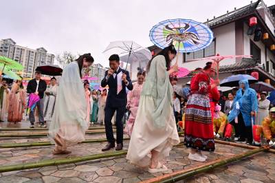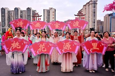 5月29日,游客在市竹山县桃花源景区开心体验竹杆舞、汉服巡游、听官渡民歌、观看抬轿娶亲等民俗展演活动。