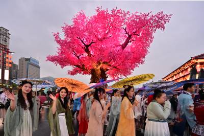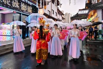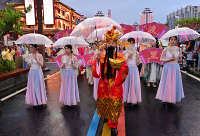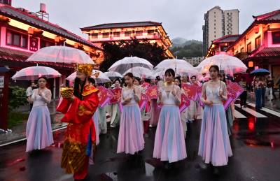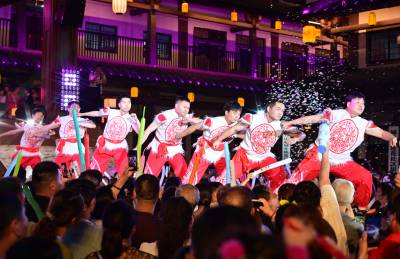 据了解,竹山县桃花源景区景区占地面积8万平方米,建筑面积7万平方米,包括水上景观区、广场光影艺术区和以“食、游、购、娱、体、展、演”于一体的沉浸式商业夜游区。为使新开街的景区“流量”变“留量”,该县将“女娲炼石补天传说、《桃花源》原型地、古庸国文化”融于到 “非遗”传承中,创作出一大批独具地方特色的民歌、剪纸、皮影戏等文创产品,借景区舞台,以乡镇为单位,搞好文艺节目集中展演活动,为备战“端午节”景区旅游接待提前预热。