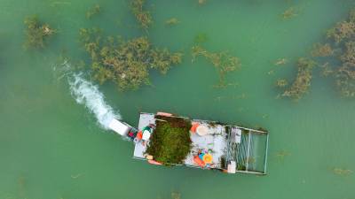 2024年6月20日,十堰市房县大河城区半岛湾段,农民“河长”在操作割草机在收割打捞水草。