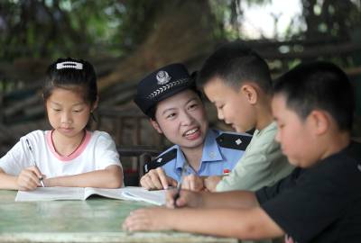7月3日,湖北省荆门市公安局漳河新区分局“巾帼志愿者”在杨店村,为留守儿童开展法治安全宣传、心理健康教育、暑期课业辅导等志愿服务。