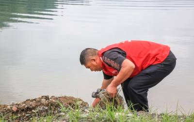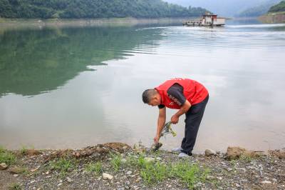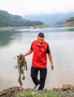 2024年7月4日,竹溪县新洲镇板凳岭村村党支部书记、优秀党务工作者、守护青山绿水志愿服务队领头人杨付军在他给自己划分的守护青山绿水责任区清理竹山县潘口水电站淹没区,板凳岭村辖区水库边垃圾。
