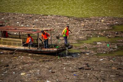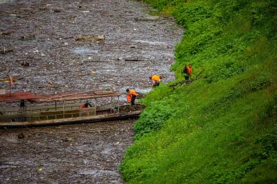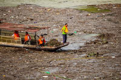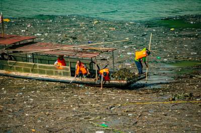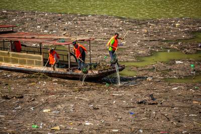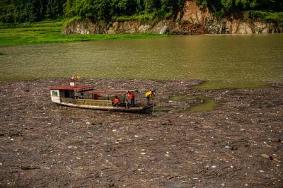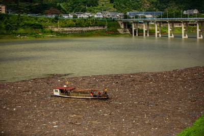 7月12日,在竹山县深河乡双湾村潘口水电站库区,工作人员正在打捞水上漂浮物。双湾村位于潘口水电站库区的上游,每次降雨过后,库面飘来大量的枯枝落叶、杂物等漂浮物。堵河是汉江的最大支流,水源汇入丹江口水库。为确保一江清水持续北送,竹山县围绕“天蓝、地绿、水清、气爽” 的总体目标,建立了县、乡、村三级河湖长体系,常态化巡查检查河湖库区,确保河面无杂物、河中无障碍、河道无垃圾,营造水清流畅、岸绿景美、人水和谐的的生态新图。(视界网 章磊 曾广学 摄)