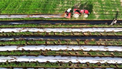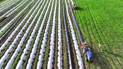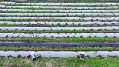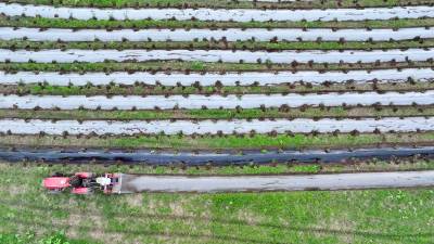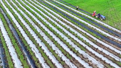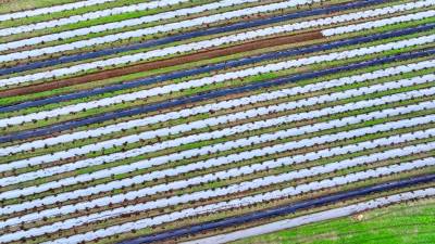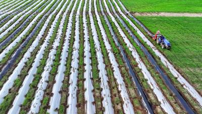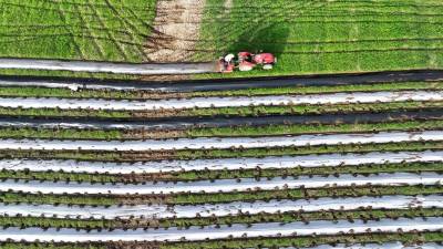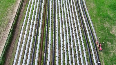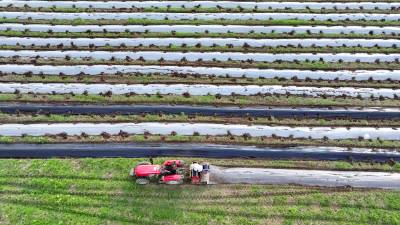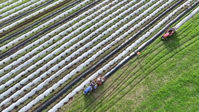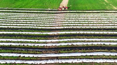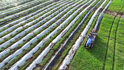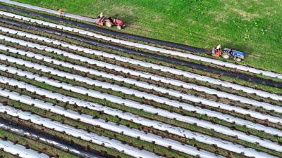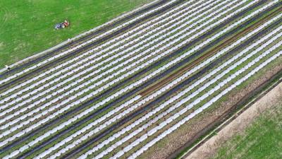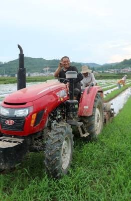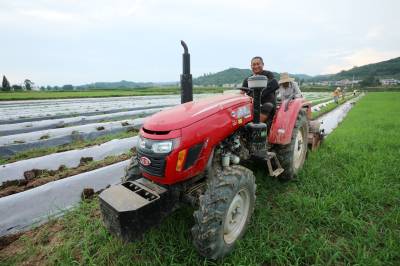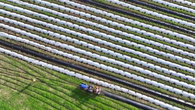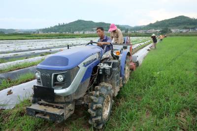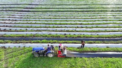 2024年8月3日,十堰市房县军店镇何家村有机蔬菜基地,郝氏有机农业专业合作社农机师傅操作起垄覆膜一体机垄埂覆膜,田间地头一幅农忙景象。