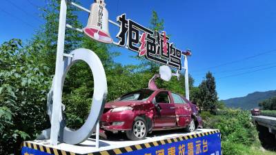2024年8月12日,十堰市房县土城镇穿山堰村,房县至十堰一级路旁的交通事故警示台,一辆实景小轿车诠释酒驾的危害,提醒过往司机师傅和当地机动车驾驶人员拒绝酒鸳、守护平安。