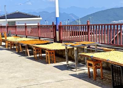 8月13日,巴东县中元子村的村民们趁着晴好天气,纷纷忙碌着晒制洋芋果。家家户户门前的“巴寨子”(一种篾器)上铺满金黄色的洋芋果果,构成一道独特的风景线。