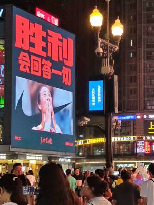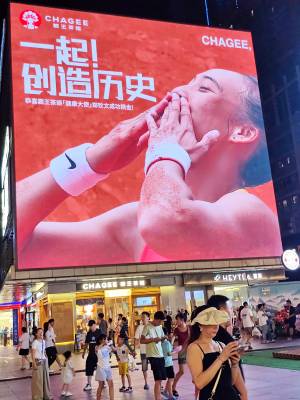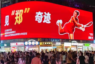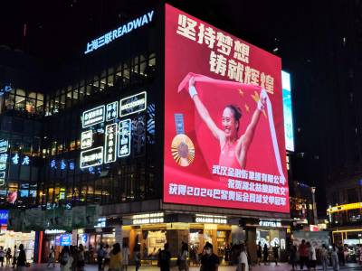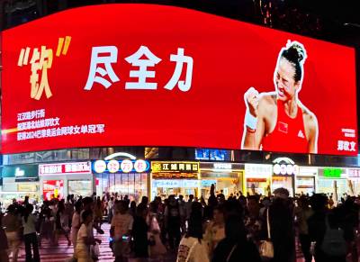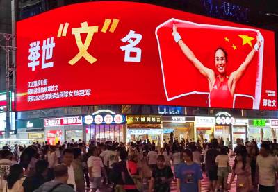 8月11日晚,在武汉市江汉路商业步街头,到处可见湖北网球运动员郑钦文在法国巴黎第33届夏季奥运会上荣获女单网球冠军的精彩瞬间巨幅公益广告,表达了湖北武汉人民向郑钦文的祝贺,表达了湖北武汉人民祝贺法国巴黎奥运会圆满成功,表达了湖北武汉人民对中国体育代表团在奥运会上勇夺40牧金牌、27枚银牌、24枚铜牌取得境外参赛最好成绩似喜悦之情。