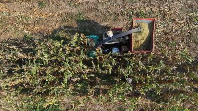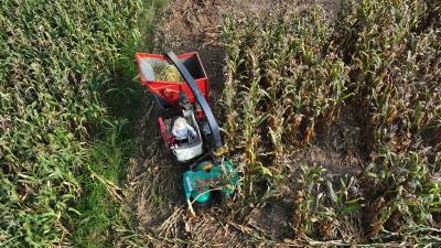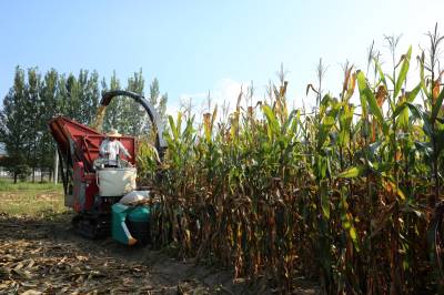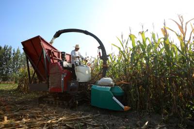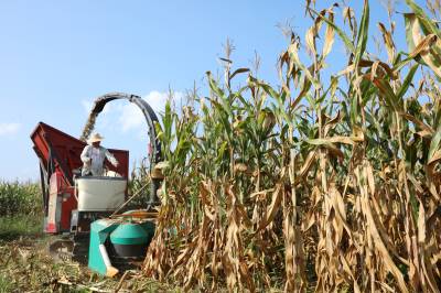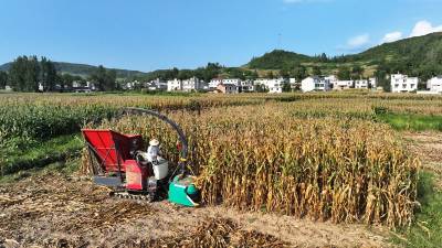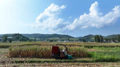 2024年8月21日,十堰市房县军店镇三溪沟村玉米秸秆基地,当地农民驾驶秸秆粉碎机在田间粉碎收储废弃秸秆。