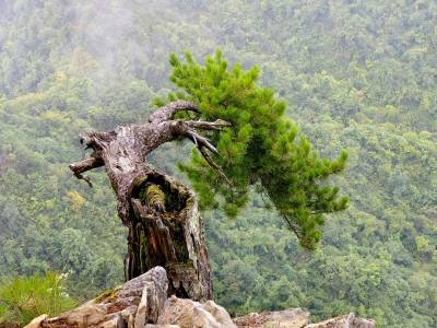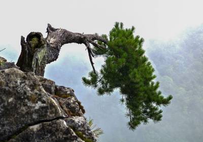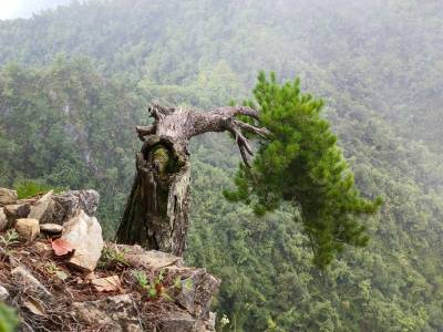 8月28日,湖北堵河源国家级自然保护区洪坪管理站站长袁孝文在保护区境内的竹山县柳林乡洪坪村刀儿山巡护监测时,惊喜地发现一株“孤独”的虬枝松树,傲然挺立在海拔2300米的悬崖绝壁之巅。于是就拍下了这棵媲美“竹山版迎客松”的奇观。