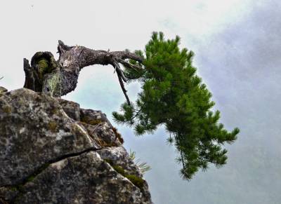 照片中,雾蒙蒙的天空与松树形成了鲜明对比,更凸显了松树的坚韧与挺拔,它的枝叶在风中摇曳生姿,仿佛在与自然的力量进行一场无声的较量,展现出一种令人动容的生命之美。