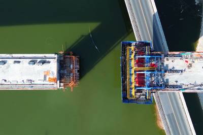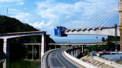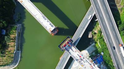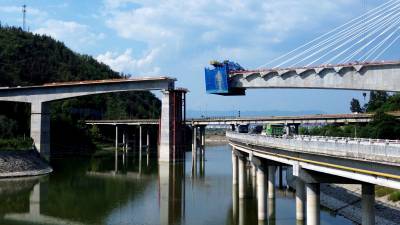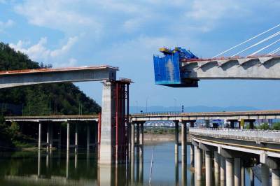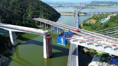 2024年9月2日,工人们正在加紧“西十高铁”柳家河福银立交大桥“斜拉索桥面延伸”的合拢施工。 “西十高铁”湖北段“六大重难点工程之一”的柳家河福银立交大桥,先后跨越柳家河、G209国道桥、G70福银高速桥。该大桥全长456.75米,其中斜拉桥部分全长285.5米,最大跨度136米,主塔高68米,设置有18对共36根拉索,采用双索面扇形布置,为单塔斜拉桥。 目前该大桥的斜拉桥面已挂索14对28根,与西桥面仅有约10米距离,“合龙”在望,预计一个月后“接龙”。