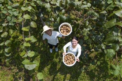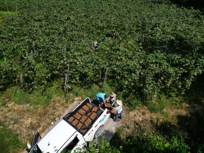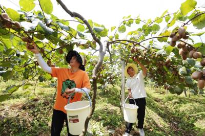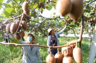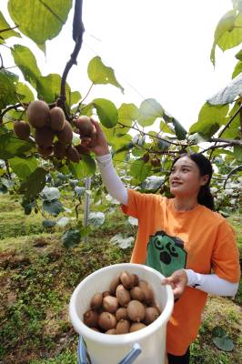 2024年9月1日,湖北省恩施土家族苗族自治州咸丰县清坪镇高峰村村民在基地上采摘猕猴桃。 湖北恩施土家族苗族自治州咸丰县清坪镇高峰村成立4个猕猴桃种植专业合作社,发展优质猕猴桃1000余亩,现大多进入丰产期,亩产在2000斤以上。入秋以来,不少游客和客商到果园现场采摘采购,给当地果农带来可观的经济收入,每天销量在1万斤以上。 目前,高峰猕猴桃已注册商标,由合作社统一标准、统一包装、统一价格,共同呵护现有的品牌和口碑,并着手申报国家地理标志产品。