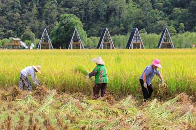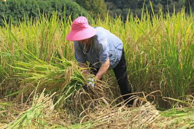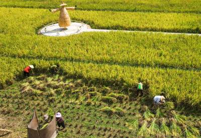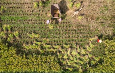 2024年9月20日,湖北省恩施市白果乡下村坝村观音塘的村民在田间收获稻谷。 秋分节气临近,湖北省恩施市各地的村民抢抓农时收割稻谷,庆丰收,田间地头一片农忙景象。