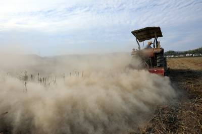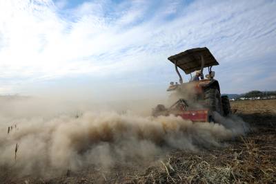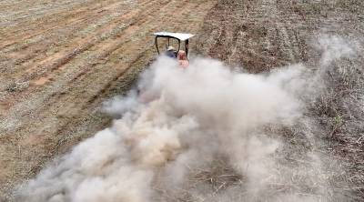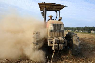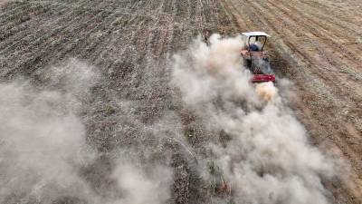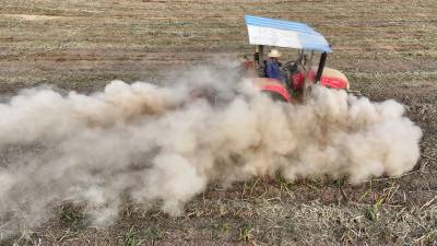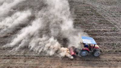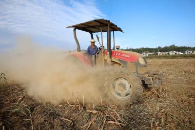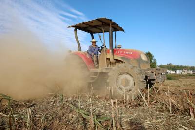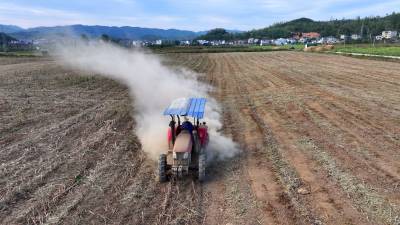 2024年9月24日,十堰市房县军店镇中村高梁产业基地,当地农机手驾驶拖拉机粉碎高梁秸秆残茬。
