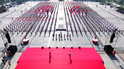 2024年9月25日,十堰市房县诗经文化广场,“唱响房县·筑梦中国”百场万人唱红歌跳广场舞展演活动正式启动,参演人员齐唱《我和我的祖国》《不忘初心》《祖国你好》红歌,以《我们都是追梦人》《中国红》红歌做伴奏,热烈庆祝中华人民共和国成立75周年。
