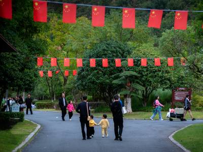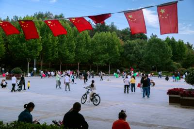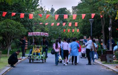 2024年10月2日,在十堰市四方山生态植物广场上不少市民陪着孩子在植物园里骑单车、荡秋千、放飞气球。愉快地玩耍,逍遥自在地度过国庆假日。