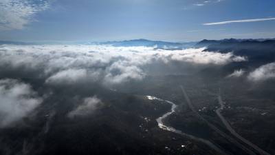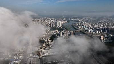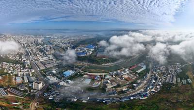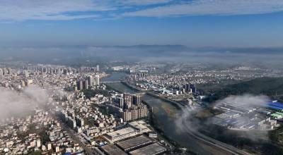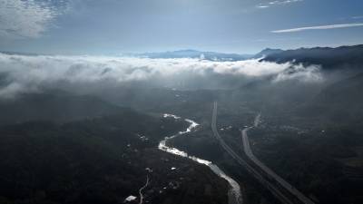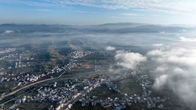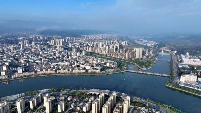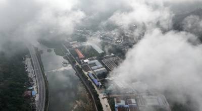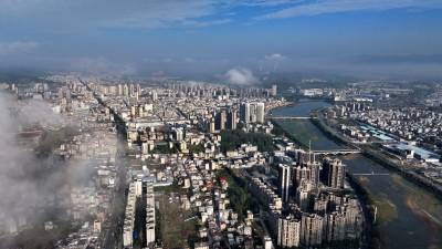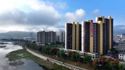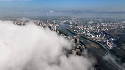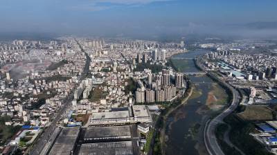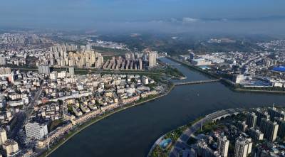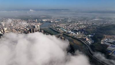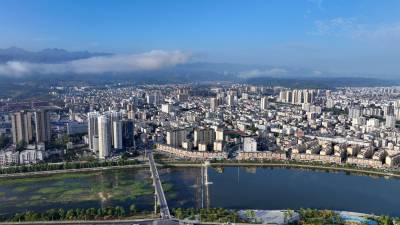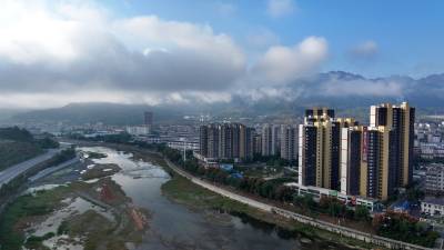 2024年10月2日,雨后清晨航拍十堰市房县城关镇中心区,汇入长江流域的马栏河水清岸绿,云雾缭绕,犹如水墨山水画般。