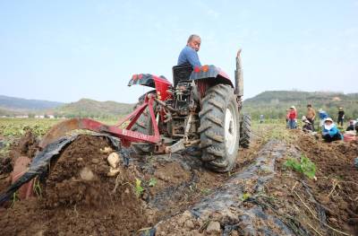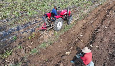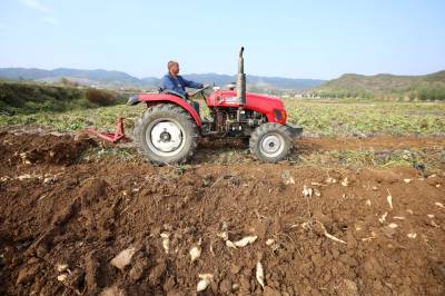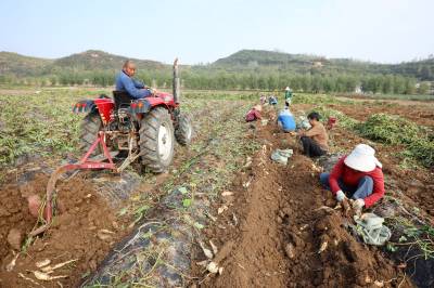 2024年10月8日,十堰市房县军店镇军马村生态白玉薯产业基地,“铁牛”穿梭田间起挖白玉薯,当地农民随后去除裹在白玉薯上面的泥土,装袋、上车。