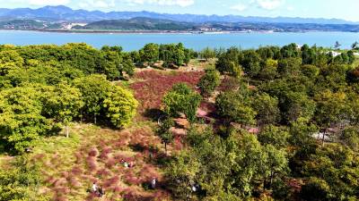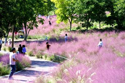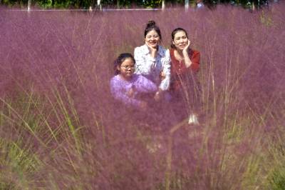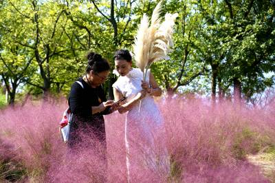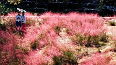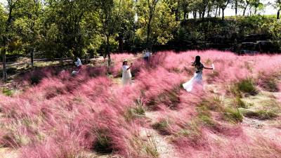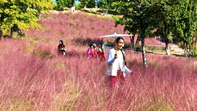 秋天是什么颜色?可以是你想象的所有色彩。深秋时节,在湖北省十堰市郧阳区中华水园汉石公园里出现大片粉色花海,如梦似幻,吸引众多市民拍照打卡。据公园管理者介绍,这粉色的花叫粉黛乱子草,以草为名,却比花更美,是大自然赐予的独特秋色。如云如雾般的粉黛乱子草在阳光照耀下朦朦胧胧的令人沉醉,远看粉红一片,近看若有若无。2024年10月18日,湖北省十堰市郧阳区茶店镇中华水园汉石公园的粉黛花海,众多游客游玩拍照。视界网王涛摄