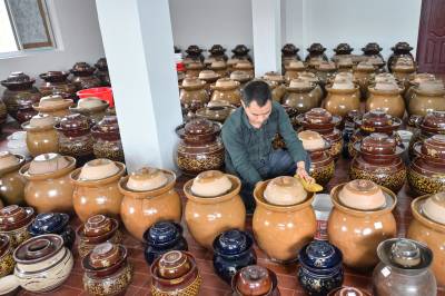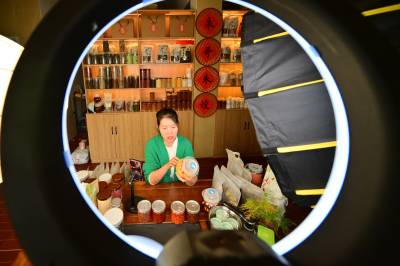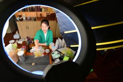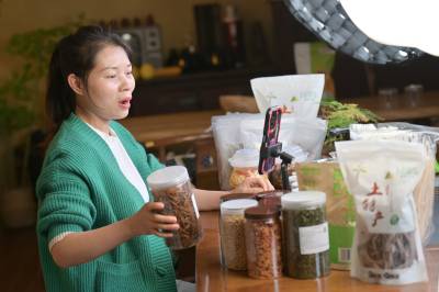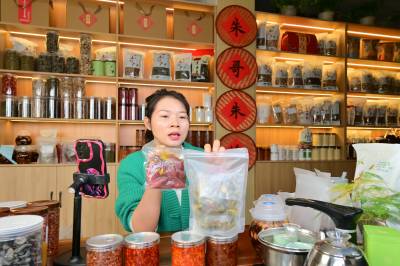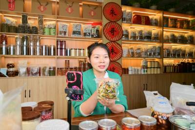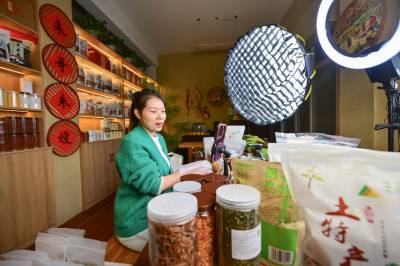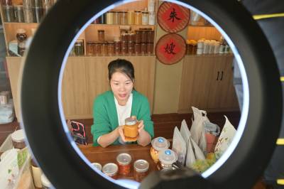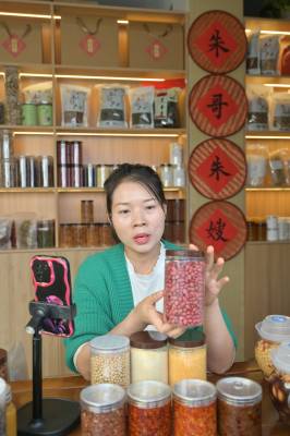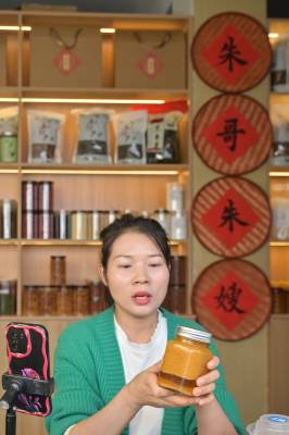 10月19日,竹山县麻家渡镇杮树坪村“朱哥朱嫂”抖音电商平台,工作人员在直播间分享“零添加”腌制酸阳禾姜、豇豆、辣椒的食用方法。据“朱嫂”贺芳介绍,今年前9个月,该公司销售品牌腌制酸菜、豆腐乳、食粮、食用菌、茶叶达300多万元。