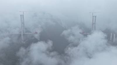 2024年10月20日上午,湖北省宜昌市至来凤高速公路五峰县城段,建设者冒着蒙蒙细雨,踏着青云梯,搭建天桥,以此雄伟壮观的劳动场面,庆祝五峰土家族自治县成立四十周年。