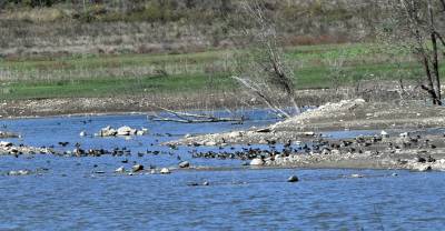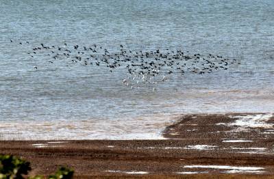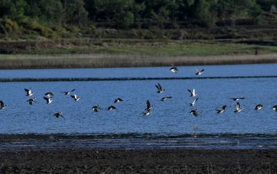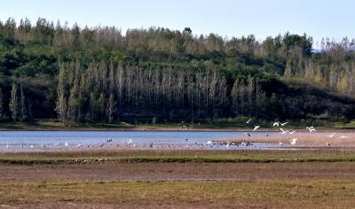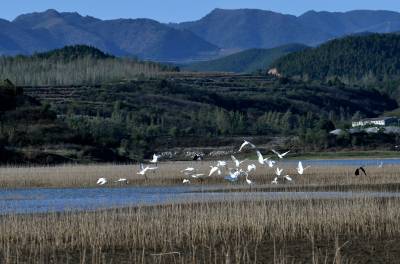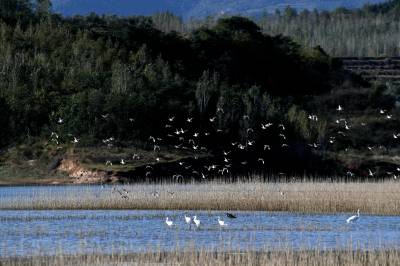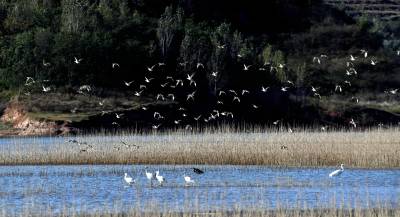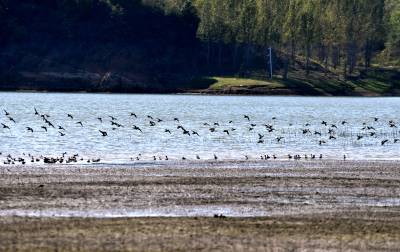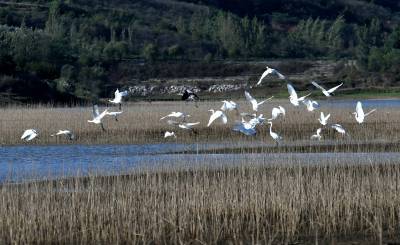 2024年10月22日,成群的候鸟在湖北省十堰市郧阳区郧阳湖国家湿地公园翩翩起舞,这是今秋首批南迁候鸟飞抵郧阳湖国家湿地公园。