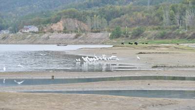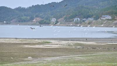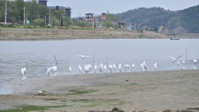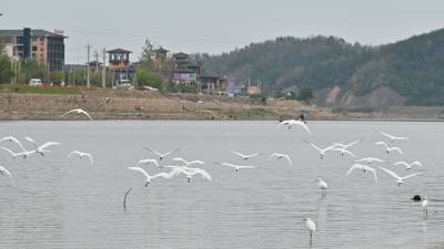 10月20日,成群白鹭在英山县温泉镇两河口水域时而翩跹飞舞,时而水边觅食小憩,成为一幅生态美、白鹭欢的美好图景。