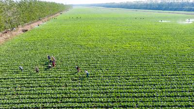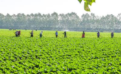 10月24日,湖北金润农业发展有限公司的嘉鱼县蔬菜种植基地嘉鱼平安洲8000多亩包菜 白菜长势喜人,上百名菜农们在给蔬菜,除草,松土、施肥热火朝天,预计蔬菜在12月上市。