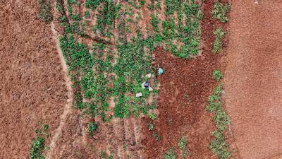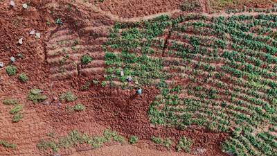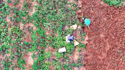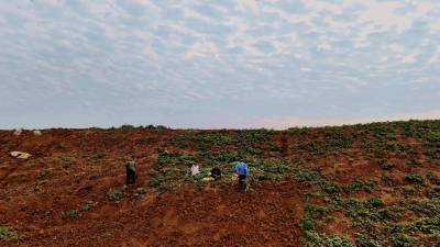 十堰市郧阳区茶店镇长坪村是郧阳红薯粉条的主产区。霜降时节,农民忙着采收红薯,准备加工红薯淀粉。 红薯种植是郧阳区的主导产业之一,据农业部门统计,今年全区种植红薯10多万亩,已形成酿酒、食品、粉条等较为完整的产业链,带动当地农民增收,助力乡村振兴。 11月3日,郧阳区茶店镇长坪村农民在地里挖红薯。(无人机照片)视界网王涛摄