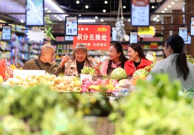 2024年11月5日,在湖北省荆门市掇刀区掇刀石街道一家“连心超市”,参与志愿服务的民政救助对象凭积分券兑换等价物资。
