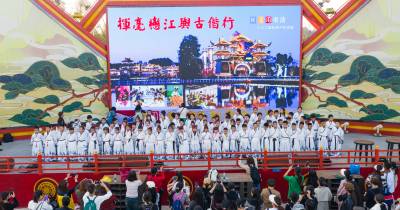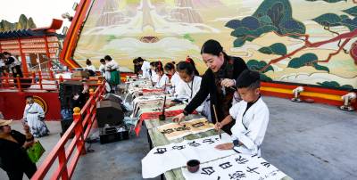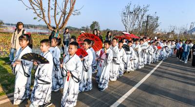 11月10 日,嘉鱼县翰墨园100多学生们身着整齐汉服在嘉鱼恋江湖旅游景区挥毫洒墨,诵读《弟子规》、《西游记》等经典,让孩子体验嘉鱼水乡文化,感受跨越时空,与古偕行。