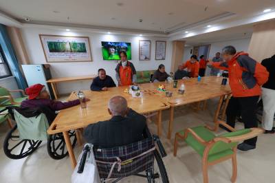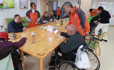 11月11日,在襄阳市一家民营医养结合养老院,老人们在工作人员协助下做游戏。