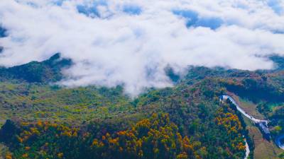 2024年11月10日,湖北省恩施土家族苗族自治州恩施市板桥镇大山顶村,层林尽染的群山“搭配”山间的云雾,构成了一幅美丽的画卷。 恩施州位于湖北省西南部,属亚热带季风性山地湿润气候,海拔落差大,小气候特征明显,境内绝大部分是山地,惯称“八山半水分半田”。(视界网 张远明 摄)