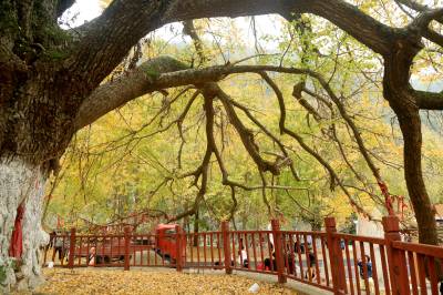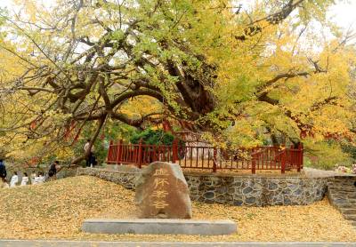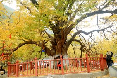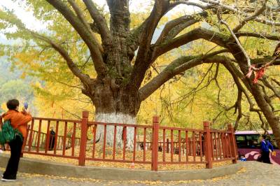 图8、图9:园内一株3000年的“虚怀若谷”2023年被评为“湖北最老古树”,金秋尽披“黄金甲”;